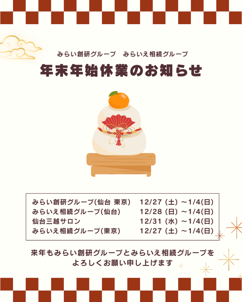 みらい創研グループ・みらいえ相続グループより年末年始に関するお知らせをご案内申し上げます。